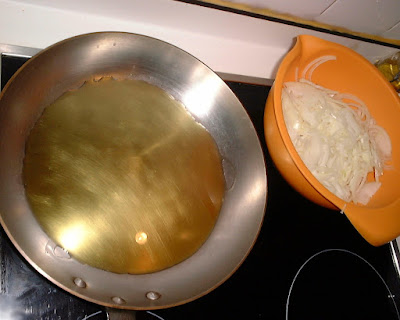 Put oil in a pan; use a bunch., cover the bottom. It's olive oil so it's good for you (Mediterranean diet and all that).